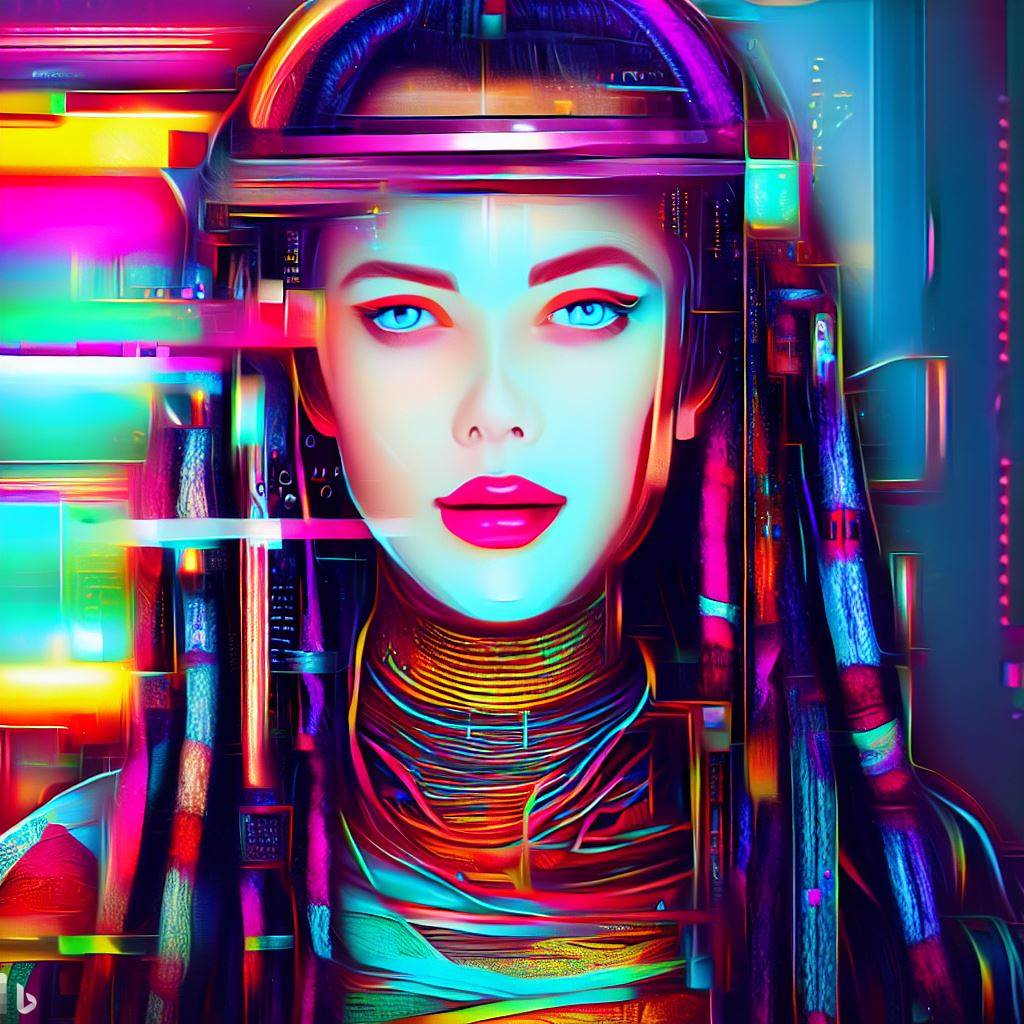 PROMPT: futuristic cyberpunk version of monalisa, high tech, bright colors, colorful, future