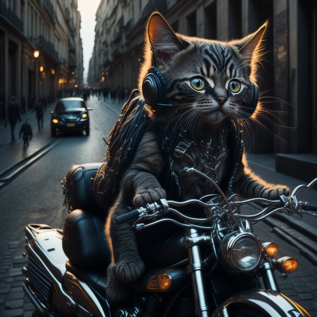 PROMPT: heavy metal kitten cat with headphones with rock song while riding a motorcycle on paris street